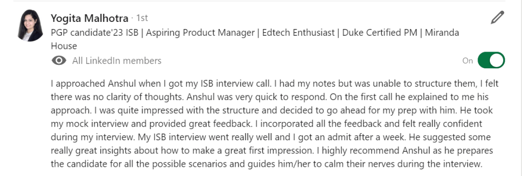 - And a few more deep dive into work questions + some questions on future plans, like which consulting firm are you aiming for at isb